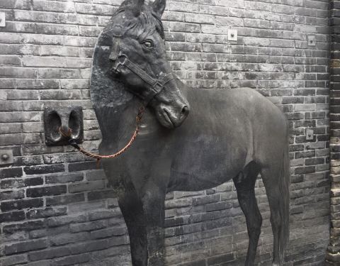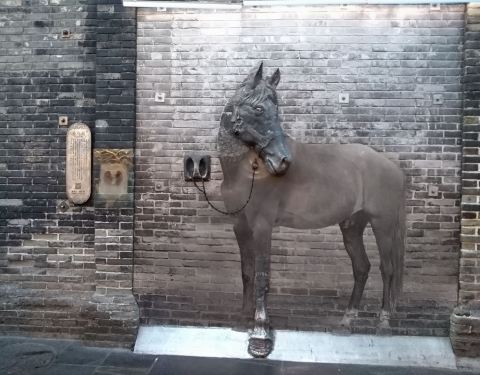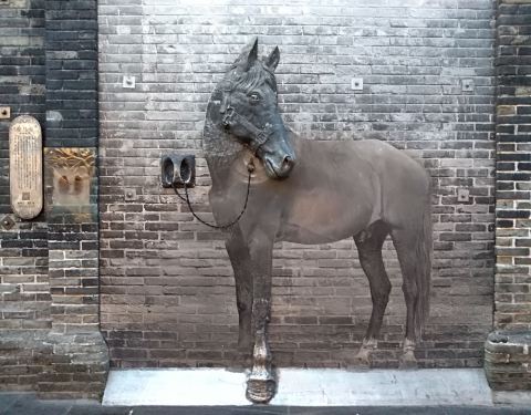 ...这里有不少人在拍照,墙壁上的马匹雕像很有立体感,马头和前左脚突出,鼻子的绳子栓在墙上,很有意思