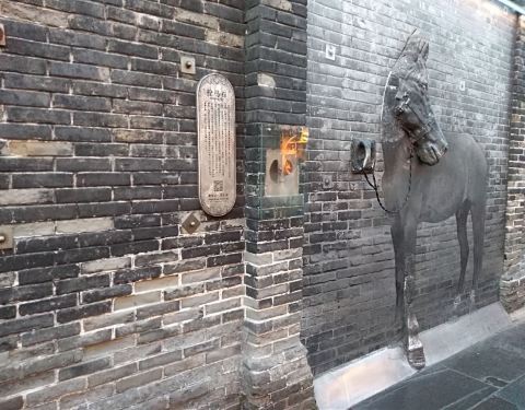 拴马石位于窄巷子中部的老墙上,在古迹的旁边镶嵌着一匹拴在马石上的马,生动的反映了当年的盛景