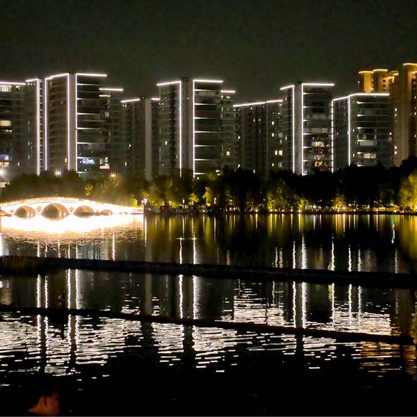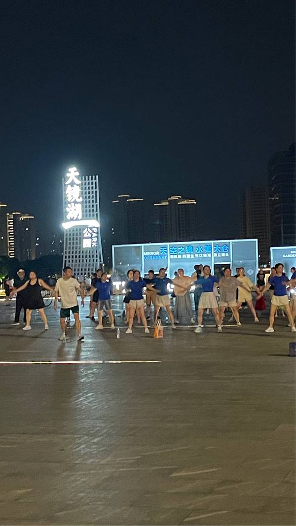 沿着环湖步道,人流熙熙攘攘。夜风带着湖水的湿润和微凉,吹散了白天的燥热,却吹不散人们的热情。广场上,音乐声此起彼伏。有人随着动感的节奏跳广场舞,动作整齐又充满活力;整个天镜湖的夜晚,热闹却不喧嚣,温暖而充满生机,仿佛这座城市的快乐都汇聚在了这里