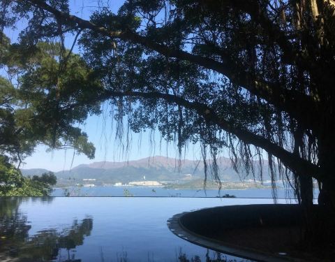 天人合一是港中大里著名的网红打卡景点。跟摄影技术无关,这个地方按下快门就是这种效果。位于香港中文大学内的景观,位于山顶,有一汪被榕树笼罩的池塘,池水里倒映着天光和树影,与远方的海连接成一片。