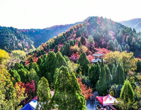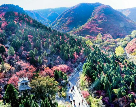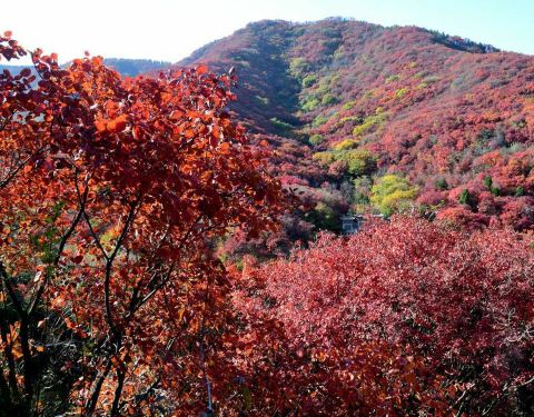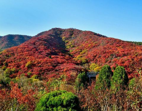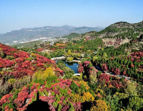 到济南红叶谷游览,可登上景区内的万叶塔欣赏红叶谷的全貌