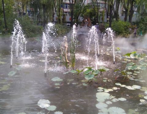 很多人在这里锻炼身体,晚上有大妈集体跳广场舞,建造精巧的景点星罗棋布,掩映在绿树花丛之中。