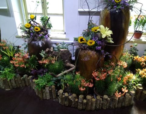 花团锦簇的万字楼,正在举行花展,各种造型设计的很独特别致,还看见一只展览的孔雀标本,很漂亮的一只,万字楼是闫西山为他父亲修建的。