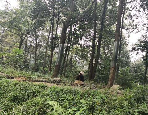 基地拥有开阔的山林风光,自然风景很美,是夏季休闲避暑的清凉之地,也为大熊猫生活提供了良好的环境。这里将熊猫分为三个区域,分别是海归大熊猫、幼年熊猫、成年熊猫区域,熊猫大多懒懒的呆在高高的树上,非常可爱。