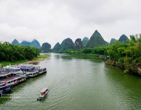 漓江上有一座长207.2米的双拱混凝土的大桥「阳朔大桥」, 是阳朔迄今为止最长的公路桥。 站在桥上,可以很好地观赏漓江风光, 一侧往漓江上游看, 碧莲峰宛如一朵含苞欲放的莲花,山旁是居民区; 另一侧往漓江下游看,隐约可见几栋房屋, 就是东街和《印象·刘三姐》的所在地。