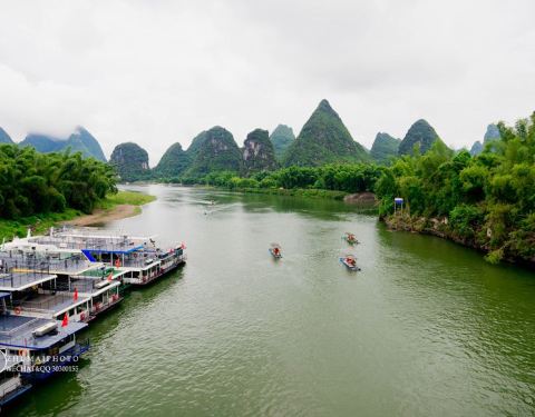 漓江上有一座长207.2米的双拱混凝土的大桥「阳朔大桥」, 是阳朔迄今为止最长的公路桥。 站在桥上,可以很好地观赏漓江风光, 一侧往漓江上游看, 碧莲峰宛如一朵含苞欲放的莲花,山旁是居民区; 另一侧往漓江下...