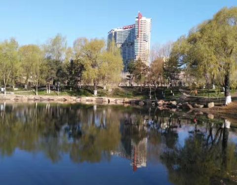 单位门口,经常锻炼,可以徒步,可以做器械,有假山,有小湖,夏日绿树成荫,冬天雪满丛林,挺美!