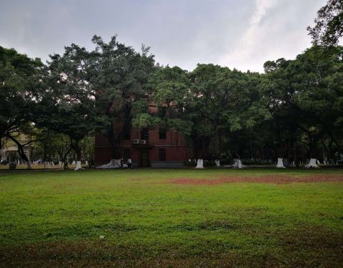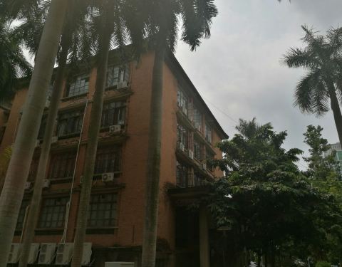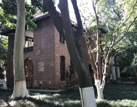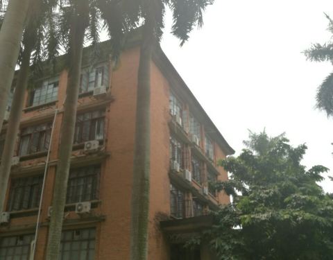 这栋办公楼与陈寅恪故居只隔着一个大草坪,和周围其他小楼一样,红砖建筑,草木掩映