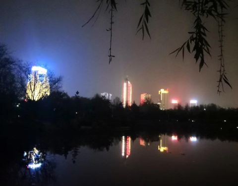 河滨公园又渐渐恢复了宁静,回望绿树摇曳,灯光闪烁,公园正如同一位多情的少女,正含情脉脉地注视着...
