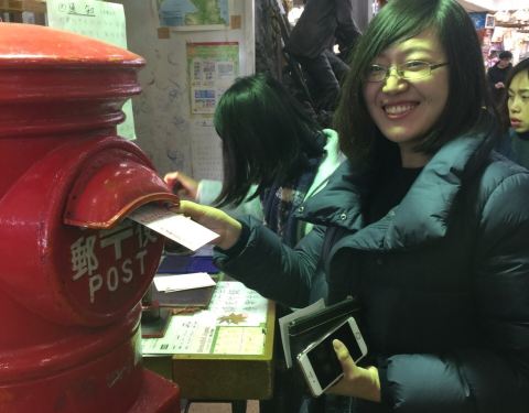 到富士山,大家都会给自己及亲朋好友寄个风光明信片做纪念。这家邮局生意很好,店里面不让拍照,明信片的系列很多,挑选了几张填好寄回国,结果一张都没收到。