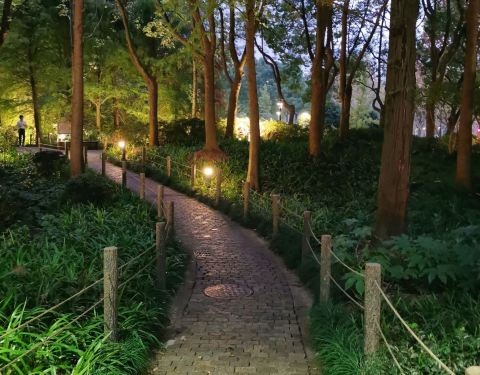 这片绿地东面是华山路,朝南就是春光坊,幸福路在西边,北方是湖南路,四通八达,免费无遮拦开放式模式,里面划分为了八个景区:杉杉相映,林森鸟啼,绿波引胜,叠溪飞流,栈桥生趣,秋色生辉,童趣欢天,碧野芳...