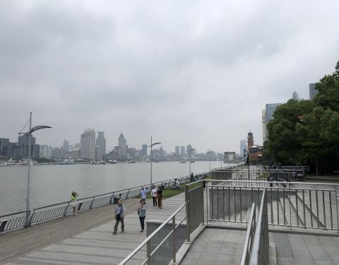 浦东的东昌滨江绿地和陆家嘴滨江绿地比人明显少了很对,所以对我们这些散步的人来说也就多了一份宁静,不过沿江边不能一直走,会有饭店把沿江区域围入他们的私人空间,我们要绕着走。