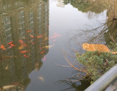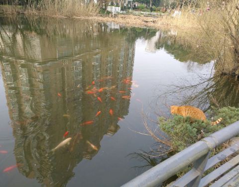 小区楼下的免费公园,尤其周末很热闹,很多遛鸟的,大草坪可以踢球放风筝。还有个鱼塘很多金鱼,小朋友们很喜欢喂鱼。晨练,广场舞,还有个小游乐场