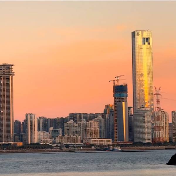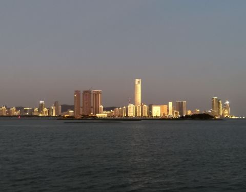 海沧湾公园最独特的魅力,在于它提供了“回望厦门岛”的绝佳视角。站在公园中段的观海平台上,对岸的鼓浪屿、鹭江道、双子塔尽收眼底,像幅流动的城市画卷。白天,阳光洒在鹭江面上,货轮与游船往来穿梭,划出白色的航迹;傍晚,对岸的灯光次第亮起,双子塔的玻璃幕墙反射着晚霞,鼓浪屿的轮廓在暮色中若隐若现,美得像场不真实的梦。
