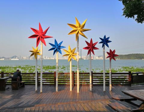 最妙的是“观海长廊”。这段架空在滩涂上的栈道,让游人能零距离触摸海岸的肌理。退潮时,滩涂上的小螃蟹在泥地里钻出密密麻麻的洞,招潮蟹挥舞着一只大螯,像在向路人打招呼;涨潮时,海水漫过栈道下方的桩脚,浪花溅起的水珠落在裤脚,带着咸湿的气息。有位赶海的老人告诉我:“每月初一十五大潮后,这里能捡到小海螺,当年海沧还是小渔村时,我们就靠这片滩涂讨生活。”