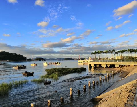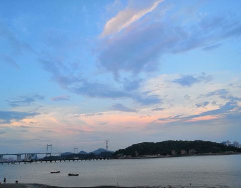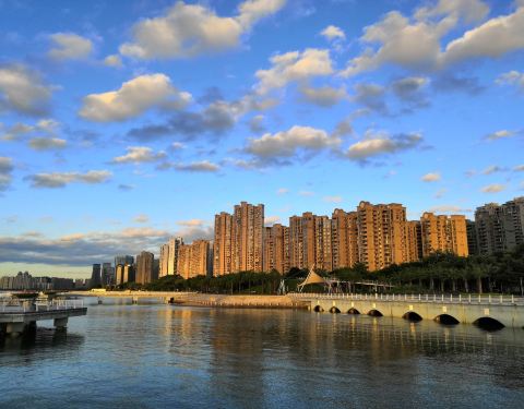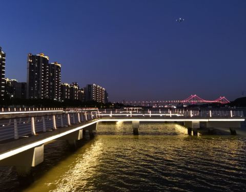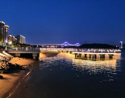 夕阳西下时,我坐在观海长廊的长椅上,看着对岸的灯光渐渐亮起。海沧大桥的灯光变成了温暖的橙黄,像条发光的项链;红树林的轮廓在暮色中模糊,只听见鸟雀归巢的鸣叫;赶海的人提着半桶收获,哼着闽南小调往家走。