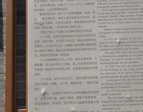 位于天津市河北区黄纬路与新开河交汇处254医院大门左侧的曹家花园是军阀曹锟花园的俗称,占地,原为清末天津大买办孙仲英的花园,始建于光绪二十九年,即1903年,1906以重金转售曹锟,曹锟进行了大规模重建,挖湖...