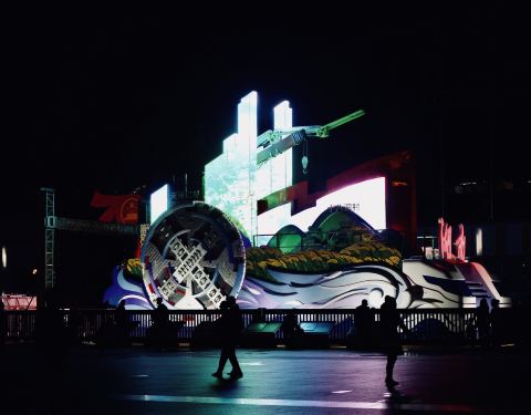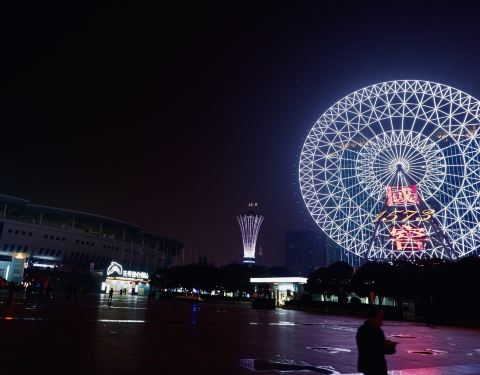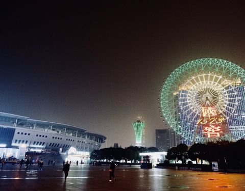 白沙广场·超级多人的整体广场舞 背靠贺龙体育场,这个白沙广场还是很大的 虽然是晚上过来 没想到的是人气那么高涨 这里和全国的广场一样 聚集了一大波跳舞的广场大妈 但是这里貌似算是我第一次看到那么多人穿着一样的服饰跳着同一支广场舞 很震惊了啊…… 站在广场上,最具有辨识度的自然就是 屋顶的摩天轮 这里算是最有特色的建筑物了吧