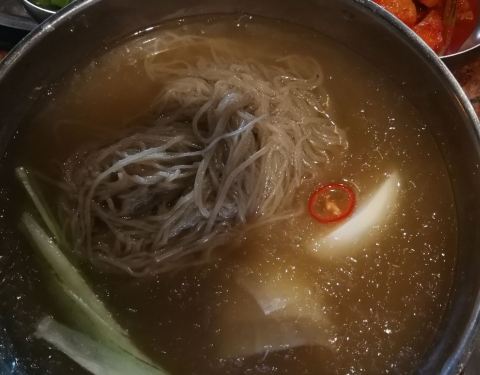 冷面很好吃,赠送四样小菜,烤青菜也不错,大酱汤口感稍差哦!非常棒的一家店,能讲中文!继续努力……
