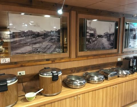 到阿里山玩的时候,中途会经过奋起湖这个小镇。这里的铁路便当挺出名的,于是中午就在这里吃饭。 餐厅人还挺多的,饭菜装在金属饭盒里,还挺复古的。内容丰富,分量足,大鸡腿还挺诱人的,性价比比较高的一餐。 如果路过,可以把午饭或者晚饭安排在这里。