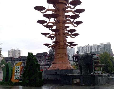 天下第一灯为中国最高的开启式景观灯,它高36.9米,用国际2.0不锈钢板整体锻造,表面涂有仿古金色漆。以仿青铜纹饰雕刻的柱体四盏灯分4层布置。创意源于东周时期青铜树形灯,柱体以仿青铜纹饰雕刻,24盏灯采用物...