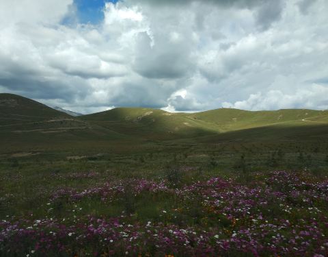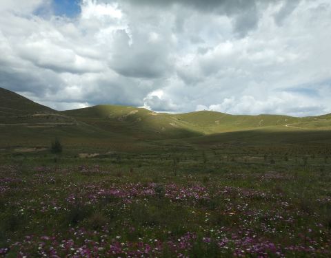 桑堆镇距稻城县城28公里处,这里风景绮丽,公路沿线的牧场开阔平展,河流平缓如镜。遥望远处,在起伏的山峦间散落着村落,牧人,牛羊,呈现一派宁静祥和的景象。