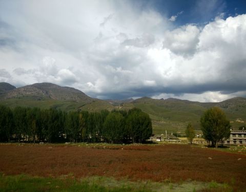 辽阔的牧场一望无边,河水缓缓流过,起伏的山峦间散落着几处民居。每到深秋来临,田间布满了红红的水草,水草后面是黄色的杨树,衬上蓝天白云,这就是桑堆红草地。