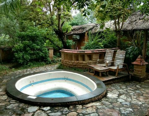 温泉度假村内的自然环境非常优美,绿树成荫简直如森林,衬托着原始古朴的茅草房别墅,尤其今天阴雨甚...
