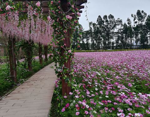花海流潮系梦里水乡隔离,其实都要行半个钟,系个小小既花园仔,里面都种左一大片花,我地去个阵啱啱系菊花,不过个花园里面都有d系假花……俾人影相,花园边系公路。行呢个花园一眼就望晒,不过可以同梦里水乡一齐玩既,花园前面个条路都系个公园,有种绿化,不过去花海就要揾啱时候,因为如果呢批花谢晒要换种苗等开花就要几个月,不过基本要睇花节日都应该无问题既。