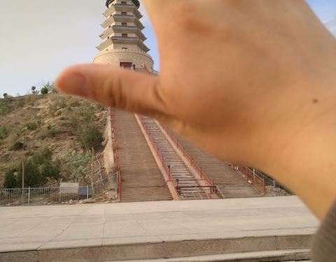 景点就在龙山的附近。里面有很多的壁画,外面的称作。基层楼的一个东归纪念塔,非常的漂亮,也非常的宏伟。这是在龙山附近拍的,作为一个小资情调的体现。
