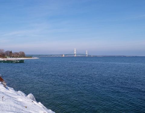 麦基诺大桥连接美国密西根上半岛和密西根下半岛,钢索吊桥结构,是密歇根州两大部分之间的必经之路。大桥南距密歇根最大城市底特律295英里。