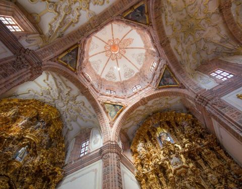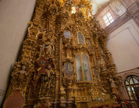 瓜纳华托的瓦伦西亚教堂是一座有着400多年历史的古老教堂,他有着明显的西班牙教堂风格,外观古朴而典雅。他最大的亮点是室内神龛,只能用金碧辉煌来形容,据说用了数百公斤的金箔,金光闪闪非常的豪华。