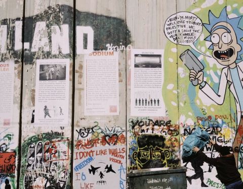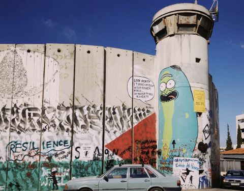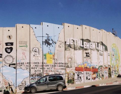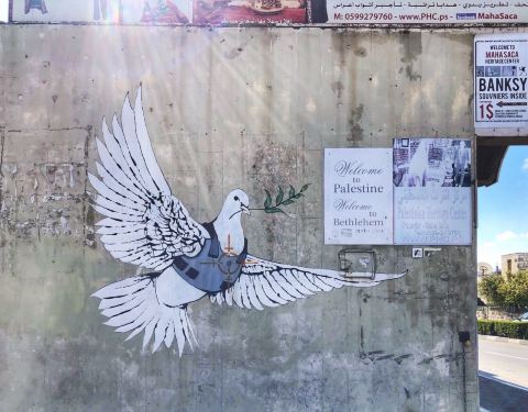 探访了巴勒斯坦地区边缘的伯利恒。以巴分界有看上去延绵不尽的隔离墙,被画满涂鸦。其中有涂鸦鬼才Bansy杰作穿防弹衣被靶心瞄准的和平鸽,也有幽默感满满的曼德拉名言配摩根费曼头像