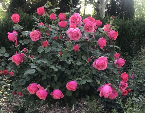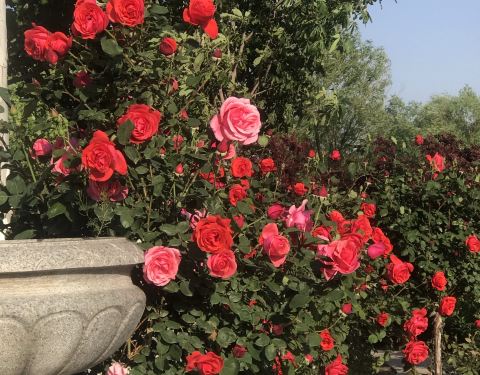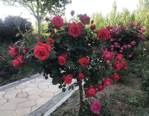 往回有,经过园丁数十年辛勤培育的玫瑰花树,枝头鲜花绽放,美到无语去赞叹。天高云淡,绿树成荫