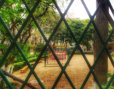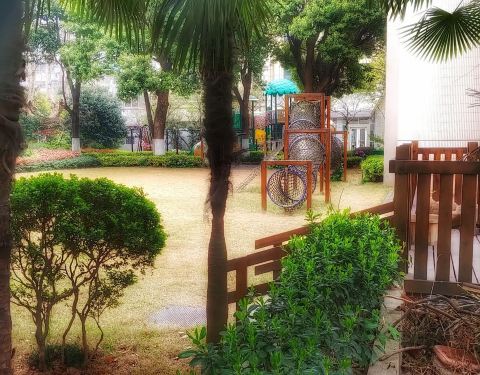 感觉还蛮高大上的一家幼儿园,可能是因为名字里有第一的字样吧。 转到旁边的路上可以从栏杆里看到幼儿园内部的场景,有挺大的一个操场,或者说类似活动空间的地方,还有一些供小朋友活动的装置,看起来都挺不错的。围栏的周边还种满了花花草草。