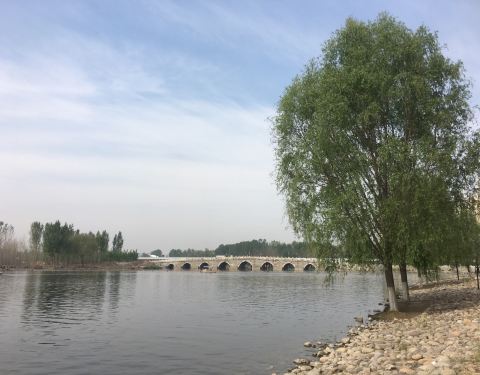 涿州永济公园 见过涿州八景之一的双塔晴烟,又来到了永济公园,望一望涿州八景拒马长虹。 涿州永济桥又叫大石桥,该桥始建于明万历二年(公元1574年),原名“拒马河桥”。万历十六年(1588年)重修,天启六年(1626年)重建。后因河道南移,故塌毁。清乾隆二十五年(1760年),直隶总督方观承奉旨在旧桥南建九孔新桥,向南延砌堤型引桥,下设22个涵洞;北侧将旧桥按涵洞形制改砌洞18并与新桥相连,以卸夏秋洪涝。乾隆赐名曰:永济,并立碑记之。其拱跨度大,九孔的桥长151米;单这九孔石桥并不稀奇,加上石桥两端的引桥,全桥达627米,堪称中国第一长石拱桥。永济桥砌筑采用中国起拱技法,造型优美,飞跨于拒马河之上,远望恰如一条彩虹横架两岸,被誉为“拒马长虹”,为“涿州八景”之一。 涿州免费公园,很大,有免费停车。