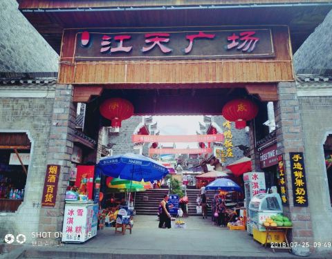 凤凰古城江天广场:位于凤凰古城虹桥东路,即从凤凰古城老城东门出来后经虹桥过沱江,下虹桥后左侧就是江天广场。这里是凤凰古城最繁华的地段之一,广场内集中了众多快捷客栈、餐馆 、土特产专营商店等。在这里既可临江观景,感受凤凰的繁华与喧闹,也可以品尝到正宗的凤凰美食,找到自己需要的土特产。