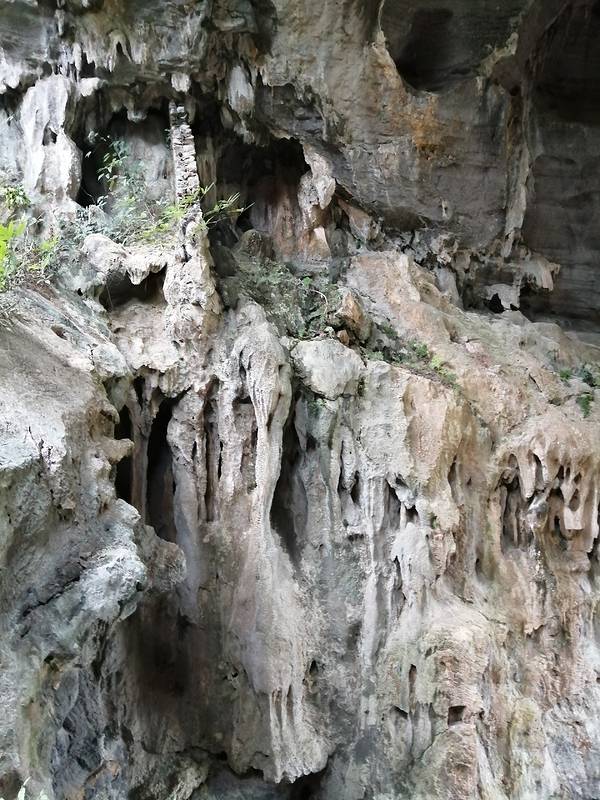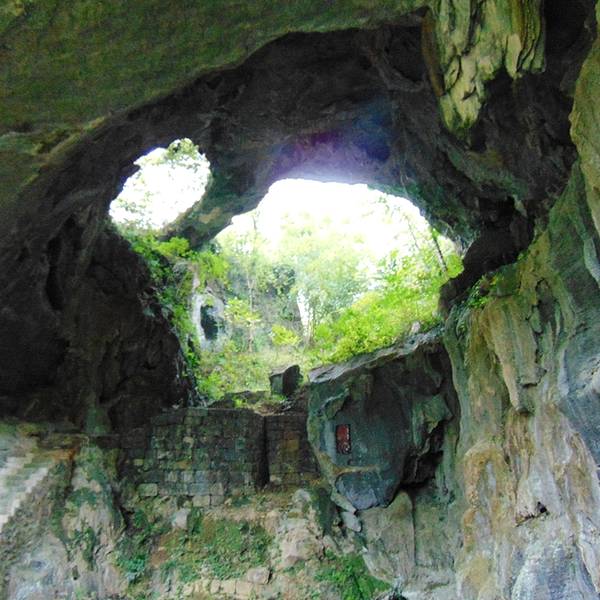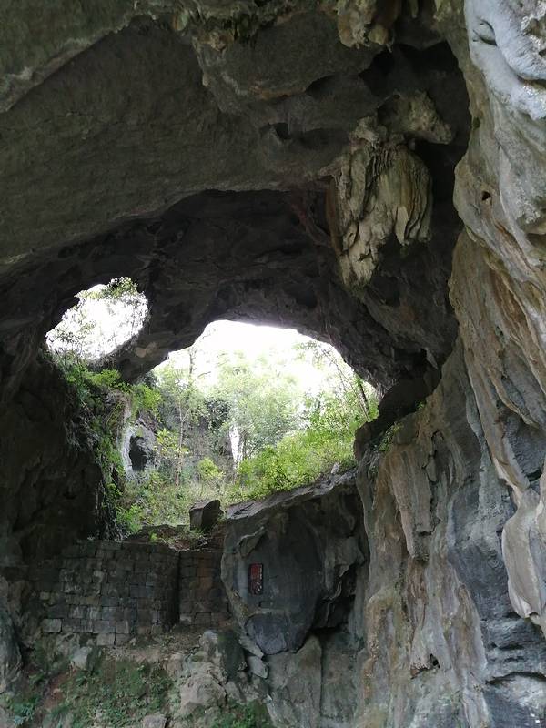两旁都是钟乳石,有一边的墙上还有一些石刻,在这里回头看,上面同时有两个洞,中间有座天生桥,真是奇观啊