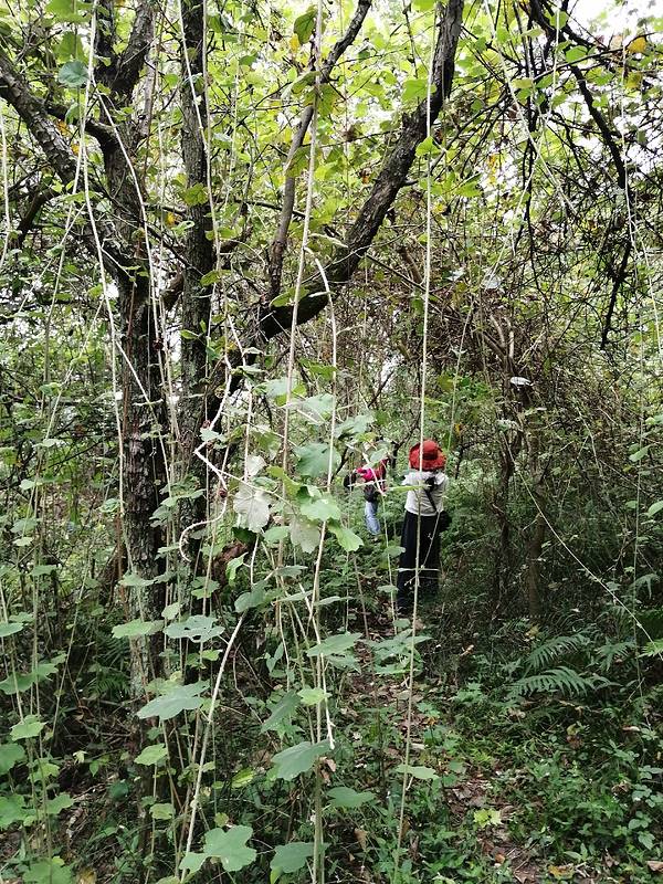 自驾游到灌阳月岭村,走到山上的步月岩的河边,不想走回头路,于是沿着灌江走,没想到河边的树长满藤蔓,好像也没什么人走的,保持着原生态。