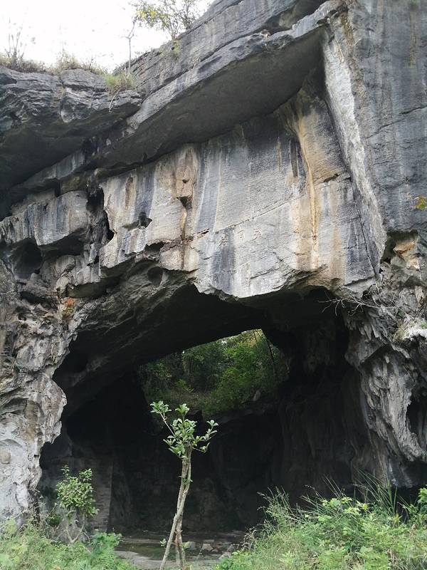 据说灌阳县月岭村步月岩附近还有白竹岩、仙家岩,三者统称竹岩。看着眼前的天窗和天生桥,走下步月岩的大厅,两旁都是钟乳石,有一边的墙上还有一些石刻,在这里回头看,上面同时有两个洞,中间有座天生桥,真是奇观啊。