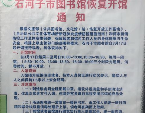 石河子作为兵团的戈壁明珠,在文明城市和卫生保健方面做到了前面。图书馆也是兵团少有的干净、整洁、明亮、宽敞、舒适。一楼为阅览室,三楼是图书杂志读书的好地方,每个位置上还有台灯和临窗的好位置经常是来得早才能占到的。
