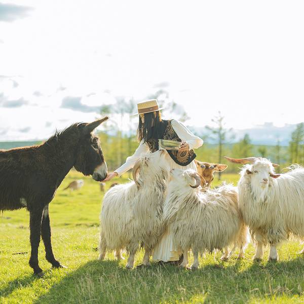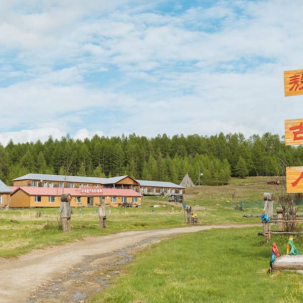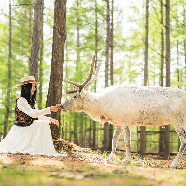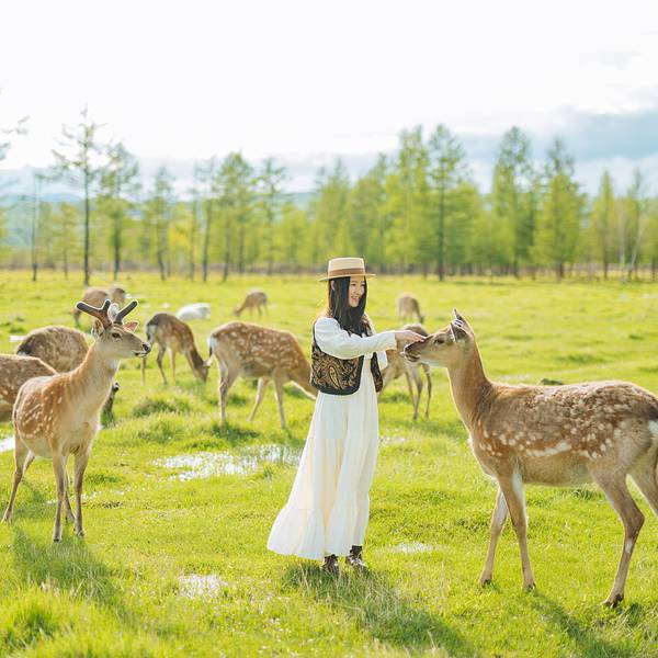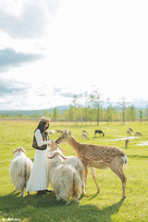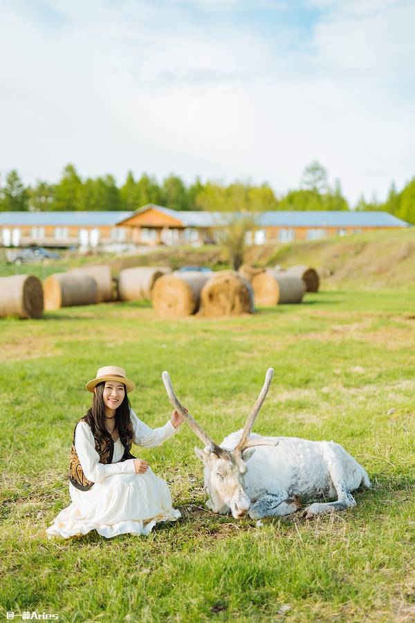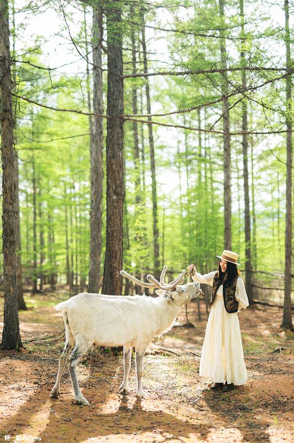 在圣诞老人身边长大,拥有大大的鹿角和厚厚的皮毛,虽然体积庞大还可以拉动雪橇,但性情非常温顺,这可爱的动物,就是驯鹿。驯鹿可不是圣诞老人故乡的特产,在呼伦贝尔有这样一个民族,他们藏于林海雪原之中,在零下40多度的极端条件下生存,坚守着最原始的狩猎方式,并与驯鹿结伴同行,鄂温克族就是中国现实版的圣诞老人。 今天穿越原始森林,就是为了追寻神鹿的踪影!兴安神鹿园坐落在得耳布尔郊外广阔的坡地上,雨后初晴,森林和木屋颇有点童话庄园的感觉。庄园女主人热情的招待我们,“你们来的正好,小家伙们吃饱了都聚堆在休息呢!”顺手塞给我一盆苔藓。顺着她手指的方向,踩着厚厚的松枝走进林间,雨后空气清爽澄澈,看不见身影的鸟儿叽叽喳喳错落鸣叫着。“摄罗子”是眼前这个用棍子跟桦树皮或兽皮搭起的三角小窝棚,它是鄂温克族在大兴安岭里最传统的居所。小时候看童话书,曾想象过自己住在森林里,有一只会拉车的驯鹿,它长着长长的鹿角,可以躺在它柔软的绒毛上睡觉。长大后真真切切牵着一只驯鹿在森林漫步,用新鲜的苔藓吸引着它的注意,拥有一对傲人犄角的家伙,用那天真清亮的小眼神,俘获我的心。第一次亲眼见到驯鹿这种神奇的生物,虽然这个季节所有的动物都在疯狂掉毛,但不妨碍它很美。 这只大概5、6岁,算是青年期的小王子,据说纯白色的驯鹿比较少见,那华丽的鹿角非常吸睛,长满厚厚的鹿茸,摸上去触感独特。这高冷的生物面对美食秒变吃货,一边喂还能一边摸。不过这家伙可聪明了,上一秒还在吃,下一秒看装苔藓的盆子空了,趁我不注意一溜烟跑没影了,最后在草坡上,发现它吃饱了晒太阳呢!神鹿园带来的惊喜远不止驯鹿,翠绿的小草垛,低洼处水流泛着光,梅花鹿回家了。它们竖起双耳,露出呆萌的眼神,一副萌萌哒的样子,瞅见有吃的,胆子大的机灵鬼试探着围了过来。眼看食物要送到嘴边,半路杀出几只陈咬金;原来神鹿园里最赖皮的是山羊,平口的小眼神可以看320度,几爷子连踩带挤,硬生生把食物给截胡了。 气死我了,对着几只老头乐一顿教训,憨憨的黑驴跑过来凑热闹,别看它块头最大,结果胆子最小,吃上一口就跑了。一群人远远看着我对着它们一顿教育,笑得不亦乐乎,而此刻的我开心得像个动物园园长,承包了整片森林。饲养员大叔见我喜欢动物,领我去梅花鹿宿舍看小鹿,小家伙和妈妈长的一模一样,还有两只今天刚生下来的小家伙躲在墙角休息。离开前听美丽的庄园主讲述这里的故事,他们几十年如一日,在大山密林深处与动物们为伍, “冬天大雪封山时,两个月都见不着陌生人。” 与草原上的“骑士”相比,森林里的生活更加隐秘孤独。漫长的严冬过去,冰雪消融后,一年只有短暂的4个月看得见色彩,夏季是鹿园最热闹的时刻,全国各地慕名而来的游客,为这里带来了活力。在这我真切的感受到,人性本真、万物有灵,我们共享同一个世界。夕阳下,依依不舍的离开呼伦贝尔小奈良,屋前白色烟雾慢慢升腾,背后是大兴安岭静谧的山林,此情此景如油画一般永远留在我的记忆中。夜晚抵达莫尔道嘎小镇,愉快的一天在热气腾腾的铁锅炖中画上句号。 第一次听说铁锅炖这个名词,是电影《羞羞的铁拳》中,马丽说的那句“铁锅炖自己”;来了大东北,才发现这里几乎什么都可以拿来炖,小鸡炖蘑菇,猪肉炖粉条,排骨炖豆角…胡老大铁锅炖在小镇宣传和口碑都做的不错。柴火、大铁锅加鱼和鸡等食材,就着玉米饼下肚,一大锅热气腾腾,满是豆腐香,抚慰了旅途疲惫。【旅行贴士】 第二天公里数:200公里 住宿:莫尔道嘎的住宿条件相对其他地方会差一点,大多是木质结构的度假村,有热水和WiFi。小贴士: 1、莫尔道嘎海拔有1千左右,夏季雨水充沛,气温比草原略低,注意夜间添加衣服。 2、每年的3月15日到6月15日是森林防火期,进入森林地区的车辆都需要提前办理“森林草原防火证”,公路沿途设有检查站,且林区小路因为森林防火,不允许随意进出。