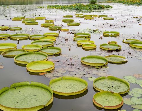 在遂宁圣莲岛的荷塘里有很多王莲浮在荷塘水面,非常漂亮