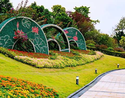 ...、美丽的荷塘、绿地的草坪、彩色的人行步道,鲜花盛开,树木葱郁,行进在这里让人赏心悦目,心旷神怡
