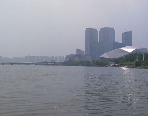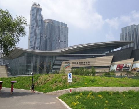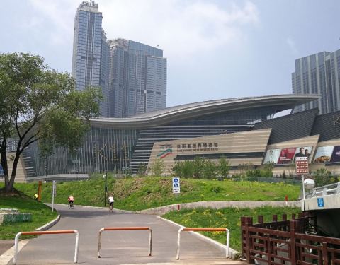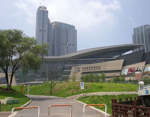 建筑很漂亮,尤其站在桥上看。规模很大,承办会议的地方。地铁出来就是,河对面是奥体中心,邻浑河大桥。后面是购物中心,整体看起来很高大上。