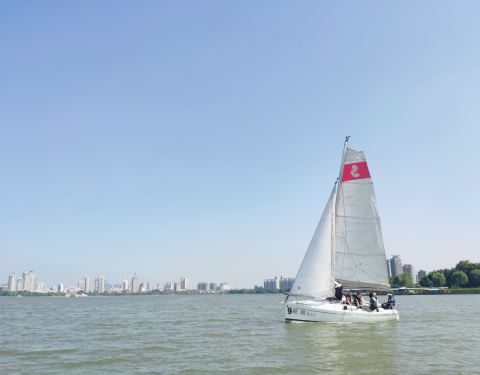【位置】团氿风景区的西南角,从3号门进去最近。最高的那尊古塔就是基地的所在。 【流程】地下一楼的更衣室换好衣服,到一楼大厅听教练讲解帆船的构造、规则、礼仪等,练习三四种结的打法,随后上船,7或9人/艘。 【玩乐】风小的时候,在湖上飘着特别舒服,来杯红酒就更惬意啦!大家一起压船,把船压斜,特别好玩。 随后我们又去划皮划艇,胳膊小酸,但还是很开心的。