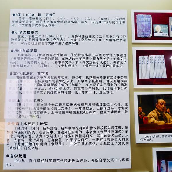 陈桥驿史料陈列室 这是我在仓桥直街内看到的最后一个展览馆了 再向前我就停止了脚步 大概继续向前,应该还有其他的展览室吧 这是我今天的仓桥直街线路算是结束了 坐标:仓桥直街内,靠近石门槛的位置 开放时间:8:30-17:00 门票:免费,需要登记信息然后就可以随便逛了 陈桥驿先生出生在绍兴,他是我国著名的历史地理学家,他的陨落是历史地理学界的一大损失啊,他对《水经注》的研究尤其的突出,在展馆内参观时,可以看到许多关于《水经注》的资料。 一走进去就能看到他的生平,真的是从小就是一个学霸啊 看别人的一生,真的跟开挂一样,那是因为他从小就非常刻苦,能如此成就的都是超级刻苦的,只是有时我们看不到。