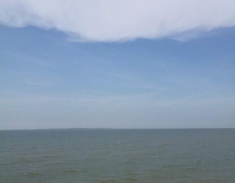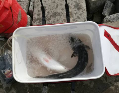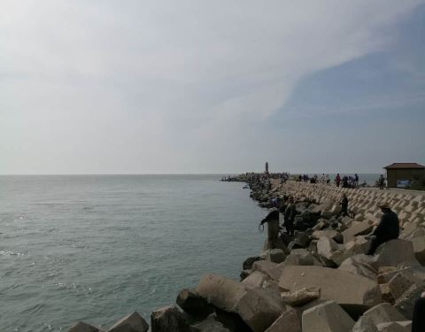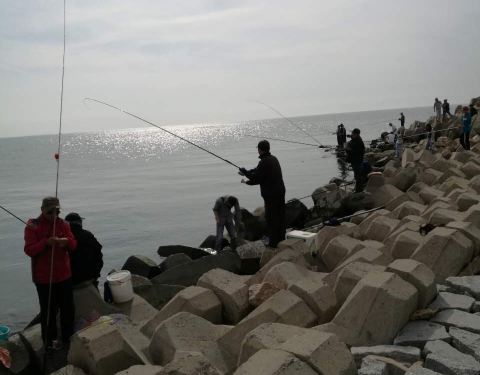 海风比较大。大堤的尽头,有个月老人的雕塑,大堤两旁有很多人在钓鱼,钓上来的鱼放在箱子里,个头还真不小