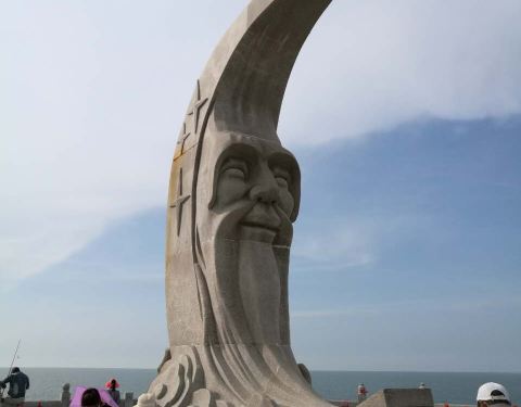 月亮老人雕塑是个老人头,被周边的海水保卫者,旁边有不少钓鱼的人。海水清澈。