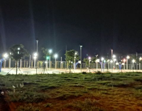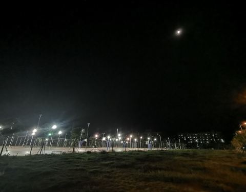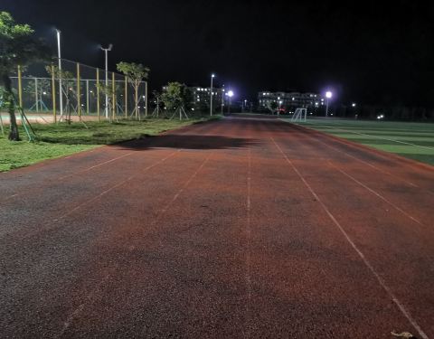 湛江白天虽然很热,夜晚还是很凉爽的,在夏日的夜晚来到足球场。天气不错,海风吹的清爽,散步也没有什么人。整个环境静谧,只有草丛中的不知名的虫呀在鸣叫。天上一轮明月,偶尔有飞机飞过。四处楼里灯光柔和。独自走走看看,感觉舒服多了。